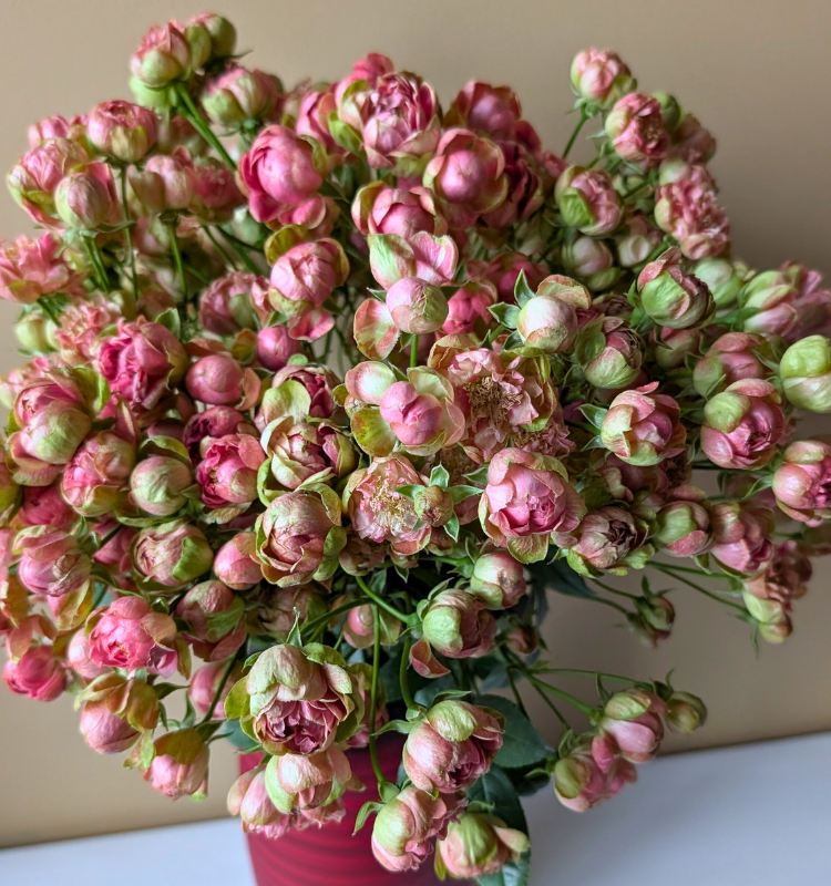Its delicate vintage tone and textured bloom structure make Princess Pinku a favorite for weddings, bridal bouquets, romantic arrangements, and luxury floral compositions. The spray formation adds volume and movement, allowing designers to create lush, dimensional pieces with fewer stems.