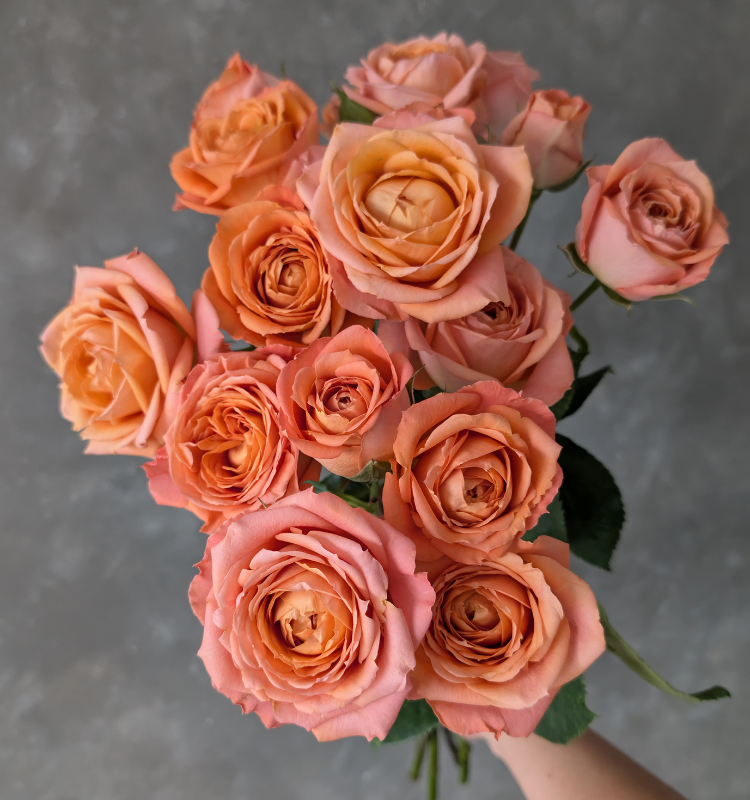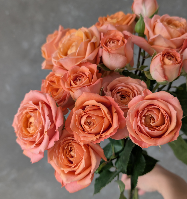 Benua spray, a stunning peach Ecuadorian spray rose that blends warm coral tones with a soft garden-style bloom. Each stem produces multiple delicate flowers, creating volume, movement, and a naturally abundant look in any arrangement.